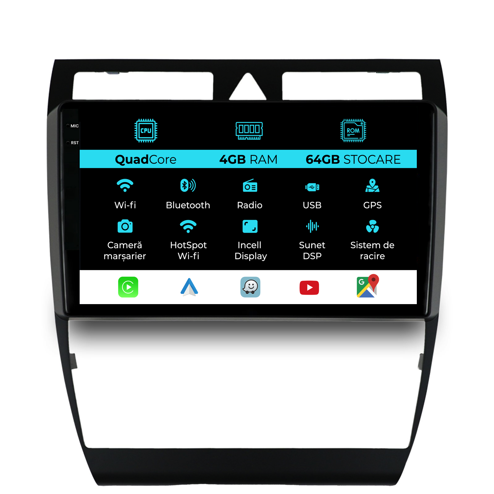 Sistem de operare: Android 13 Procesor: Quad-core 1.5Ghz Memorie RAM: 4GB Stocare interna (ROM): 64GB Dimensiune Display: 9 Inch Rezolutie ecran: 1360x800p Bluetooth: Bluetooth pentru apeluri, descarcare agenda telefonica si redare muzica WiFi: Da (Integrat) Slot Sim 4G: Nu Conectivitate retea: Hotspot telefon, router extern, dongle 3G sau 4G, CarPlay Android Auto Microfon: Microfon integrat, cu posibilitate de conectare microfon extern Alimentare: 12V Putere audio: 4x45W Egalizator DSP: Procesor de sunet digital (DSP EQ) Compatibilitate USB SD: Compatibil cu USB de pana la 128GB, suport SD prin adaptor USB Compatibilitate aplicatii Android: Compatibil cu majoritatea aplicatiilor Android din Google Play Compatibilitate CarPlay si Android Auto: Da, compatibil cu iOS (CarPlay) si Android (Android Auto) Suport pentru limbi:a Romana, Engleza, Maghiara, Spaniola, Italiana, Germana, etc. Tip ecran: TouchScreen capacitiv, multi-touch, IPS Setari luminozitate: Da Radio RDS: Da Iesire subwoofer RCA: Da Iesire video RCA: Da, cu ajutorul unui adaptor USB Iesire audio RCA: Da GPS: Da, (Google Maps, Waze, HereWeGo) Senzori de parcare: Da (Preluare senzori de parcare cu afisaj unde este cazul) Control volan: Da (Preluare comenzi volan cu canbus sau analogic unde este cazul) Compatibilitate camera DVR: Da Compatibilitate camera marsarier: Da Manual de utilizare: Da Continut pachet: Navigatie Android Rama adaptoare Cablaj de alimentare Antena GPS Conectori RCA Cablaj pentru camera de marsarier, 2 cabluri USB Canbus (doar daca este cazul) Certificat de garantie Factura fiscala Navigatia este compatibila cu urmatoarele marci auto : Audi: A6 C5 (2000-2004)