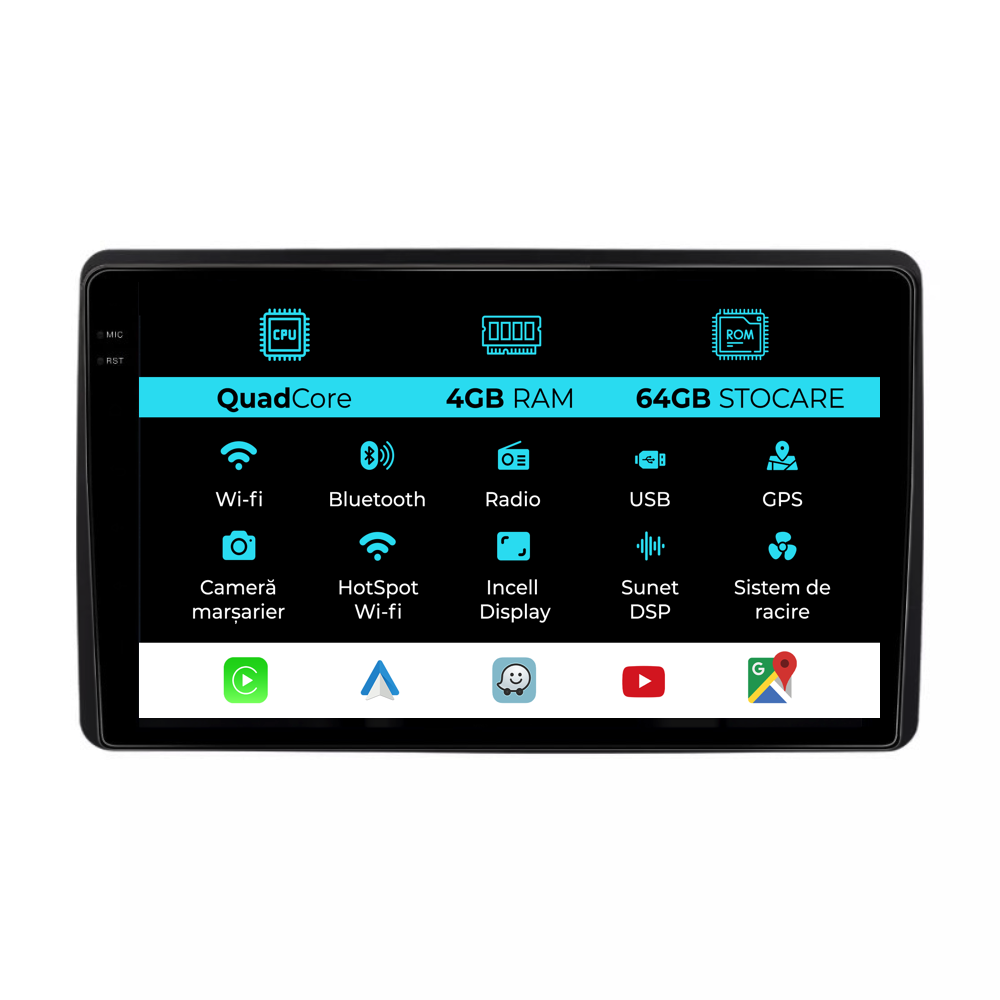 Sistem de operare: Android 13 Procesor: Quad-core 1.5Ghz Memorie RAM: 4GB Stocare interna (ROM): 64GB Dimensiune Display: 10 Inch Rezolutie ecran: 1280x800p Bluetooth: Bluetooth pentru apeluri, descarcare agenda telefonica si redare muzica WiFi: Da (Integrat) Slot Sim 4G: Nu Conectivitate retea: Hotspot telefon, router extern, dongle 3G sau 4G, CarPlay Android Auto Microfon: Microfon integrat, cu posibilitate de conectare microfon extern Alimentare: 12V Putere audio: 4x45W Egalizator DSP: Procesor de sunet digital (DSP EQ) Compatibilitate USB SD: Compatibil cu USB de pana la 128GB, suport SD prin adaptor USB Compatibilitate aplicatii Android: Compatibil cu majoritatea aplicatiilor Android din Google Play Compatibilitate CarPlay si Android Auto: Da, compatibil cu iOS (CarPlay) si Android (Android Auto) Suport pentru limbi:a Romana, Engleza, Maghiara, Spaniola, Italiana, Germana, etc. Tip ecran: TouchScreen capacitiv, multi-touch, IPS Setari luminozitate: Da Radio RDS: Da Iesire subwoofer RCA: Da Iesire video RCA: Da, cu ajutorul unui adaptor USB Iesire audio RCA: Da GPS: Da, (Google Maps, Waze, HereWeGo) Senzori de parcare: Da (Preluare senzori de parcare cu afisaj unde este cazul) Control volan: Da (Preluare comenzi volan cu canbus sau analogic unde este cazul) Compatibilitate camera DVR: Da Compatibilitate camera marsarier: Da Manual de utilizare: Da Continut pachet: Navigatie Android Rama adaptoare Cablaj de alimentare Antena GPS Conectori RCA Cablaj pentru camera de marsarier, 2 cabluri USB Canbus (doar daca este cazul) Certificat de garantie Factura fiscala Navigatia este compatibila cu urmatoarele marci auto : Dacia: Duster (2018 – 2022)