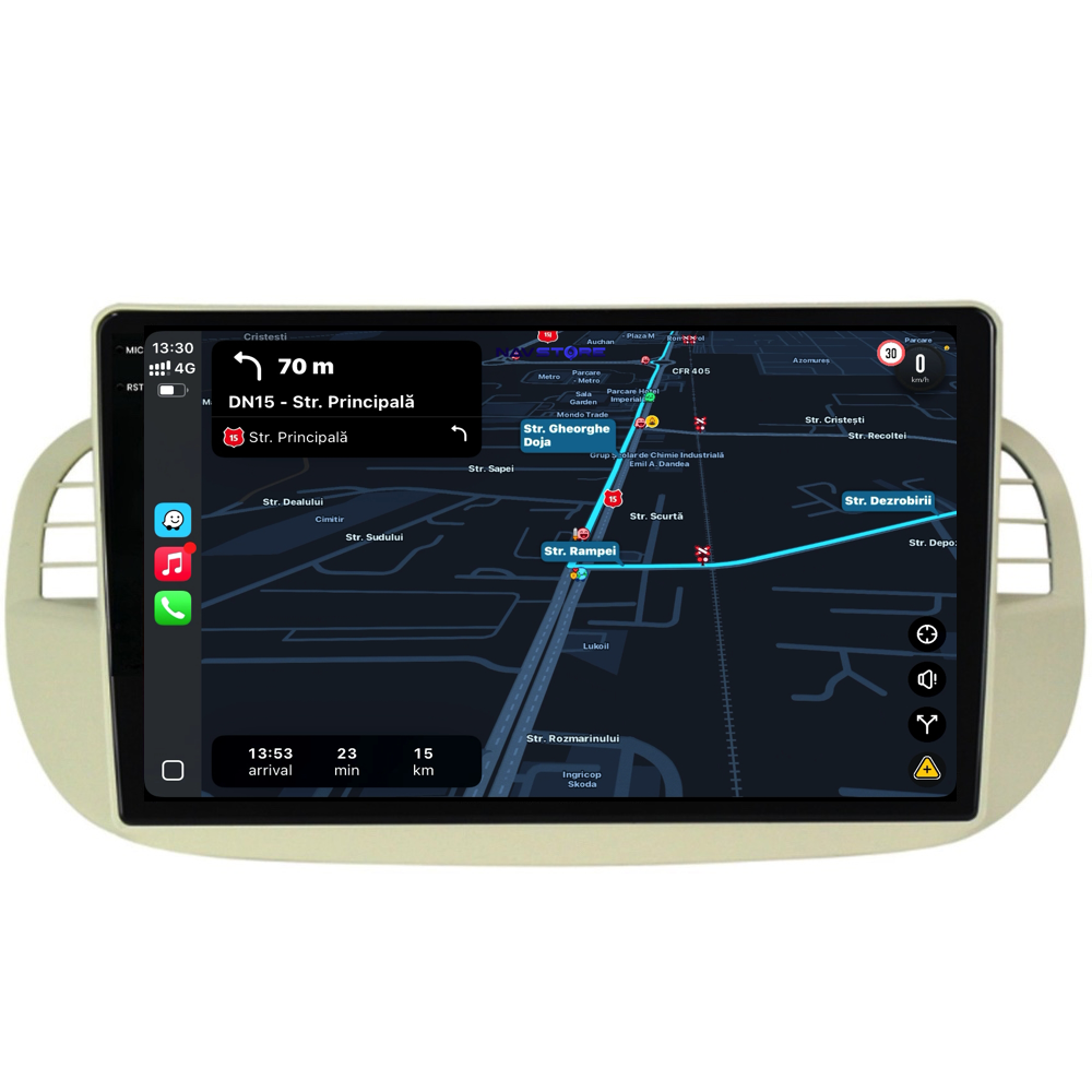 Sistem de operare: Android 13 Procesor: Octa-core Memorie RAM: 4GB Stocare interna (ROM): 64GB Dimensiune Display: 9 Inch Rezolutie ecran: 1360x800p Bluetooth: Bluetooth pentru apeluri, descarcare agenda telefonica si redare muzica WiFi: Da (Integrat) Slot Sim 4G: Da Conectivitate retea: 4G, Hotspot telefon, router extern, dongle 3G sau 4G, CarPlay Android Auto Microfon: Microfon integrat, cu posibilitate de conectare microfon extern Alimentare: 12V Putere audio: 4x45W Egalizator DSP: Procesor de sunet digital (DSP EQ) Compatibilitate USB SD: Compatibil cu USB de pana la 128GB, suport SD prin adaptor USB Compatibilitate aplicatii Android: Compatibil cu majoritatea aplicatiilor Android din Google Play Compatibilitate CarPlay si Android Auto: Da, compatibil cu iOS (CarPlay) si Android (Android Auto) Suport pentru limbi Romana, Engleza, Maghiara, Spaniola, Italiana, Germana, etc. Tip ecran: TouchScreen capacitiv, multi-touch, IPS Setari luminozitate: Da Radio RDS: Da Iesire subwoofer RCA: Da Iesire video RCA: Da, cu ajutorul unui adaptor USB Iesire audio RCA: Da GPS: Da, (Google Maps, Waze, HereWeGo) Senzori de parcare: Da (Preluare senzori de parcare cu afisaj unde este cazul) Control volan: Da (Preluare comenzi volan cu canbus sau analogic unde este cazul) Compatibilitate camera DVR: Da Compatibilitate camera marsarier: Da Manual de utilizare: Da Continut pachet: Navigatie Android Rama adaptoare Cablaj de alimentare Antena GPS Antena 4G Conectori RCA Cablaj pentru camera de marsarier, 2 cabluri USB Canbus (doar daca este cazul) Certificat de garantie Factura fiscala Navigatia este compatibila cu urmatoarele marci auto : Fiat: 500 (2007 – 2015)
