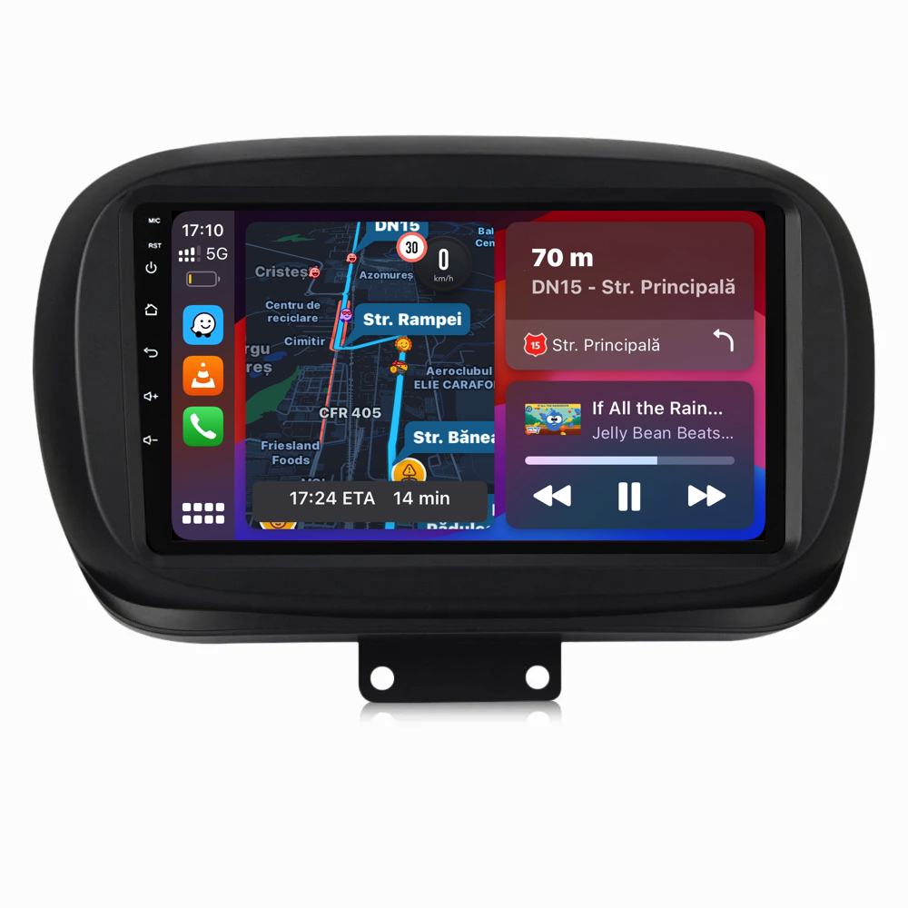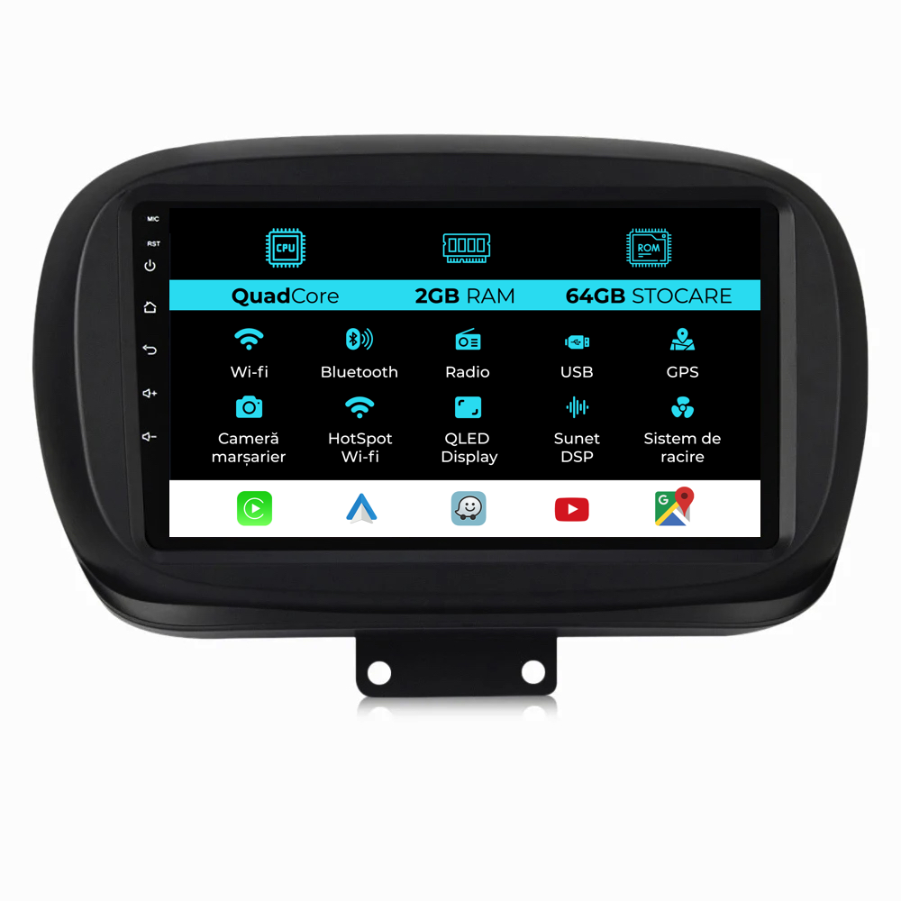 Sistem de operare: Android 13 Procesor: Quadcore Memorie RAM: 2GB Stocare interna (ROM): 64GB Dimensiune Display: 9 Inch Rezolutie ecran: 1280x720p Bluetooth: Bluetooth pentru apeluri, descarcare agenda telefonica si redare muzica WiFi: Da (Integrat) Slot Sim 4G: Nu Conectivitate retea: Hotspot telefon, router extern, dongle 3G sau 4G, CarPlay Android Auto Microfon: Microfon integrat, cu posibilitate de conectare microfon extern Alimentare: 12V Putere audio: 4x45W Egalizator DSP: Procesor de sunet digital (DSP EQ) Compatibilitate USB SD: Compatibil cu USB de pana la 128GB, suport SD prin adaptor USB Compatibilitate aplicatii Android: Compatibil cu majoritatea aplicatiilor Android din Google Play Compatibilitate CarPlay si Android Auto: Da, compatibil cu iOS (CarPlay) si Android (Android Auto) Suport pentru limbi:a Romana, Engleza, Maghiara, Spaniola, Italiana, Germana, etc. Tip ecran: TouchScreen capacitiv, multi-touch, IPS Setari luminozitate: Da Radio RDS: Da Iesire subwoofer RCA: Da Iesire video RCA: Da, cu ajutorul unui adaptor USB Iesire audio RCA: Da GPS: Da, (Google Maps, Waze, HereWeGo) Senzori de parcare: Da (Preluare senzori de parcare cu afisaj unde este cazul) Control volan: Da (Preluare comenzi volan cu canbus sau analogic unde este cazul) Compatibilitate camera DVR: Da Compatibilitate camera marsarier: Da Manual de utilizare: Da Continut pachet: Navigatie Android Rama adaptoare Cablaj de alimentare Antena GPS Conectori RCA Cablaj pentru camera de marsarier, 2 cabluri USB Canbus (doar daca este cazul) Certificat de garantie Factura fiscala Navigatia este compatibila cu urmatoarele marci auto : Fiat : 500x (2014 – 2020)