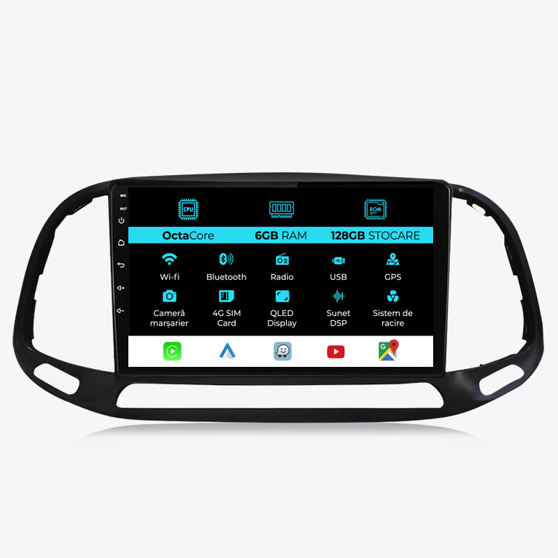 Sistem de operare: Android 13 Procesor: Octa-core 1,8Ghz Memorie RAM: 6GB Stocare interna (ROM): 128GB Dimensiune Display: 9 Inch Rezolutie ecran: 1280x720p Bluetooth: Bluetooth pentru apeluri, descarcare agenda telefonica si redare muzica WiFi: Da (Integrat) Slot Sim 4G: Da Conectivitate retea: 4G, Hotspot telefon, router extern, dongle 3G sau 4G, CarPlay Android Auto Microfon: Microfon integrat, cu posibilitate de conectare microfon extern Alimentare: 12V Putere audio: 4x45W Egalizator DSP: Procesor de sunet digital (DSP EQ) Compatibilitate USB SD: Compatibil cu USB de pana la 128GB, suport SD prin adaptor USB Compatibilitate aplicatii Android: Compatibil cu majoritatea aplicatiilor Android din Google Play Compatibilitate CarPlay si Android Auto: Da, compatibil cu iOS (CarPlay) si Android (Android Auto) Suport pentru limbi:a Romana, Engleza, Maghiara, Spaniola, Italiana, Germana, etc. Tip ecran: TouchScreen capacitiv, multi-touch, IPS Setari luminozitate: Da Radio RDS: Da Iesire subwoofer RCA: Da Iesire video RCA: Da, cu ajutorul unui adaptor USB Iesire audio RCA: Da GPS: Da, (Google Maps, Waze, HereWeGo) Senzori de parcare: Da (Preluare senzori de parcare cu afisaj unde este cazul) Control volan: Da (Preluare comenzi volan cu canbus sau analogic unde este cazul) Compatibilitate camera DVR: Da Compatibilitate camera marsarier: Da Manual de utilizare: Da Continut pachet: Navigatie Android Rama adaptoare Cablaj de alimentare Antena GPS Antena 4G Conectori RCA Cablaj pentru camera de marsarier, 2 cabluri USB Canbus (doar daca este cazul) Certificat de garantie Factura fiscala Navigatia este compatibila cu urmatoarele marci auto : Fiat: Doblo (2015 – 2019)