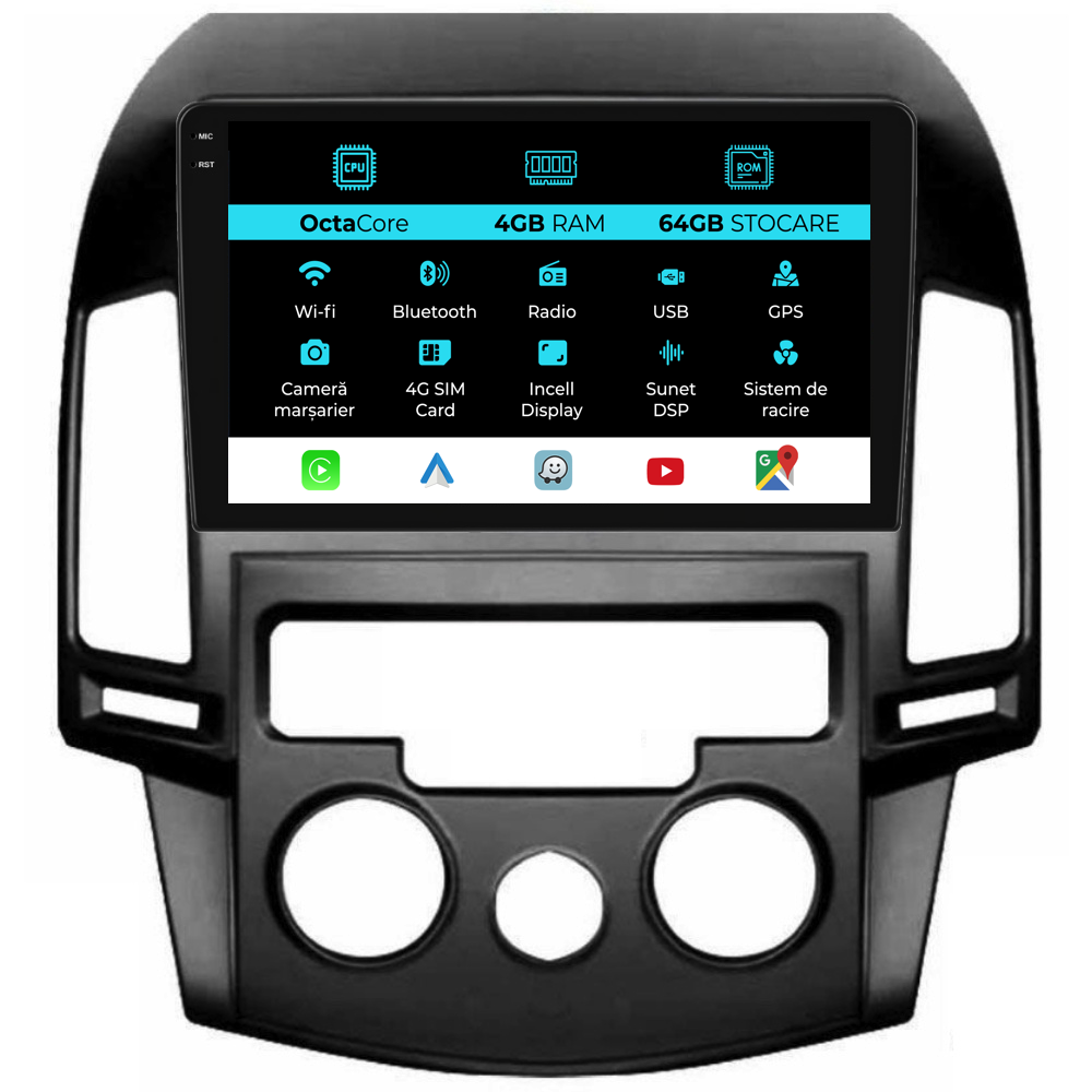 Sistem de operare: Android 13 Procesor: Octa-core Memorie RAM: 4GB Stocare interna (ROM): 64GB Dimensiune Display: 9 Inch Rezolutie ecran: 1360x800p Bluetooth: Bluetooth pentru apeluri, descarcare agenda telefonica si redare muzica WiFi: Da (Integrat) Slot Sim 4G: Da Conectivitate retea: 4G, Hotspot telefon, router extern, dongle 3G sau 4G, CarPlay Android Auto Microfon: Microfon integrat, cu posibilitate de conectare microfon extern Alimentare: 12V Putere audio: 4x45W Egalizator DSP: Procesor de sunet digital (DSP EQ) Compatibilitate USB SD: Compatibil cu USB de pana la 128GB, suport SD prin adaptor USB Compatibilitate aplicatii Android: Compatibil cu majoritatea aplicatiilor Android din Google Play Compatibilitate CarPlay si Android Auto: Da, compatibil cu iOS (CarPlay) si Android (Android Auto) Suport pentru limbi Romana, Engleza, Maghiara, Spaniola, Italiana, Germana, etc. Tip ecran: TouchScreen capacitiv, multi-touch, IPS Setari luminozitate: Da Radio RDS: Da Iesire subwoofer RCA: Da Iesire video RCA: Da, cu ajutorul unui adaptor USB Iesire audio RCA: Da GPS: Da, (Google Maps, Waze, HereWeGo) Senzori de parcare: Da (Preluare senzori de parcare cu afisaj unde este cazul) Control volan: Da (Preluare comenzi volan cu canbus sau analogic unde este cazul) Compatibilitate camera DVR: Da Compatibilitate camera marsarier: Da Manual de utilizare: Da Continut pachet: Navigatie Android Rama adaptoare Cablaj de alimentare Antena GPS Antena 4G Conectori RCA Cablaj pentru camera de marsarier, 2 cabluri USB Canbus (doar daca este cazul) Certificat de garantie Factura fiscala Navigatia este compatibila cu urmatoarele marci auto : Hyundai: I30 (2007 – 2012)