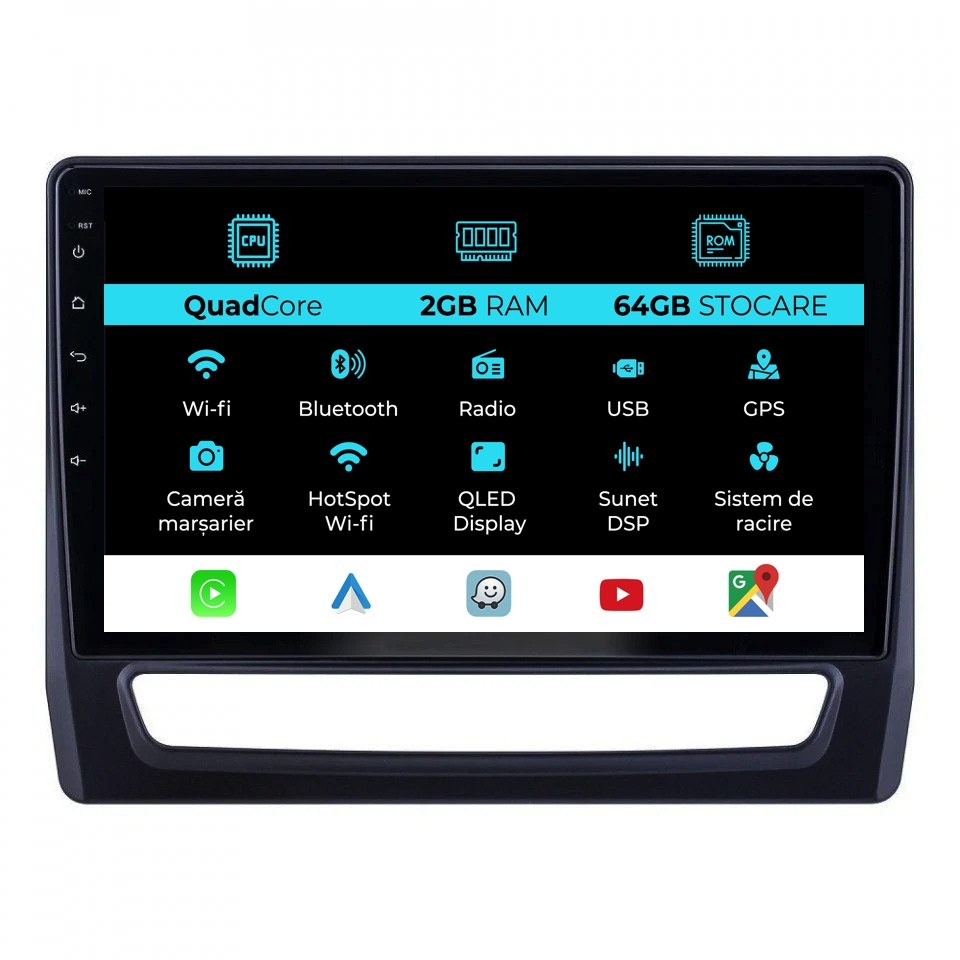 Sistem de operare: Android 13 Procesor: Quadcore Memorie RAM: 2GB Stocare interna (ROM): 64GB Dimensiune Display: 10 Inch Rezolutie ecran: 1280x720p Bluetooth: Bluetooth pentru apeluri, descarcare agenda telefonica si redare muzica WiFi: Da (Integrat) Slot Sim 4G: Nu Conectivitate retea: Hotspot telefon, router extern, dongle 3G sau 4G, CarPlay Android Auto Microfon: Microfon integrat, cu posibilitate de conectare microfon extern Alimentare: 12V Putere audio: 4x45W Egalizator DSP: Procesor de sunet digital (DSP EQ) Compatibilitate USB SD: Compatibil cu USB de pana la 128GB, suport SD prin adaptor USB Compatibilitate aplicatii Android: Compatibil cu majoritatea aplicatiilor Android din Google Play Compatibilitate CarPlay si Android Auto: Da, compatibil cu iOS (CarPlay) si Android (Android Auto) Suport pentru limbi:a Romana, Engleza, Maghiara, Spaniola, Italiana, Germana, etc. Tip ecran: TouchScreen capacitiv, multi-touch, IPS Setari luminozitate: Da Radio RDS: Da Iesire subwoofer RCA: Da Iesire video RCA: Da, cu ajutorul unui adaptor USB Iesire audio RCA: Da GPS: Da, (Google Maps, Waze, HereWeGo) Senzori de parcare: Da (Preluare senzori de parcare cu afisaj unde este cazul) Control volan: Da (Preluare comenzi volan cu canbus sau analogic unde este cazul) Compatibilitate camera DVR: Da Compatibilitate camera marsarier: Da Manual de utilizare: Da Continut pachet: Navigatie Android Rama adaptoare Cablaj de alimentare Antena GPS Conectori RCA Cablaj pentru camera de marsarier, 2 cabluri USB Canbus (doar daca este cazul) Certificat de garantie Factura fiscala Navigatia este compatibila cu urmatoarele marci auto : Mitsubishi : ASX 2 (2019 – 2025)