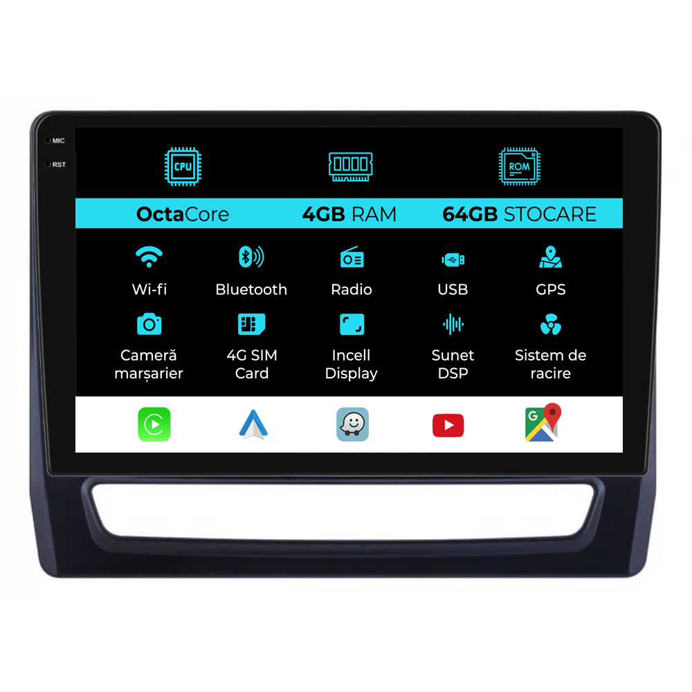 Sistem de operare: Android 13 Procesor: Octa-core 1.8Ghz Memorie RAM: 4GB Stocare interna (ROM): 64GB Dimensiune Display: 10 Inch Rezolutie ecran: 1280x800p Bluetooth: Bluetooth pentru apeluri, descarcare agenda telefonica si redare muzica WiFi: Da (Integrat) Slot Sim 4G: Da Conectivitate retea: 4G, Hotspot telefon, router extern, dongle 3G sau 4G, CarPlay Android Auto Microfon: Microfon integrat, cu posibilitate de conectare microfon extern Alimentare: 12V Putere audio: 4x45W Egalizator DSP: Procesor de sunet digital (DSP EQ) Compatibilitate USB SD: Compatibil cu USB de pana la 128GB, suport SD prin adaptor USB Compatibilitate aplicatii Android: Compatibil cu majoritatea aplicatiilor Android din Google Play Compatibilitate CarPlay si Android Auto: Da, compatibil cu iOS (CarPlay) si Android (Android Auto) Suport pentru limbi:a Romana, Engleza, Maghiara, Spaniola, Italiana, Germana, etc. Tip ecran: TouchScreen capacitiv, multi-touch, IPS Setari luminozitate: Da Radio RDS: Da Iesire subwoofer RCA: Da Iesire video RCA: Da, cu ajutorul unui adaptor USB Iesire audio RCA: Da GPS: Da, (Google Maps, Waze, HereWeGo) Senzori de parcare: Da (Preluare senzori de parcare cu afisaj unde este cazul) Control volan: Da (Preluare comenzi volan cu canbus sau analogic unde este cazul) Compatibilitate camera DVR: Da Compatibilitate camera marsarier: Da Manual de utilizare: Da Continut pachet: Navigatie Android Rama adaptoare Cablaj de alimentare Antena GPS Antena 4G Conectori RCA Cablaj pentru camera de marsarier, 2 cabluri USB Canbus (doar daca este cazul) Certificat de garantie Factura fiscala Navigatia este compatibila cu urmatoarele marci auto : Mitsubishi : ASX 2 (2019 – 2025)