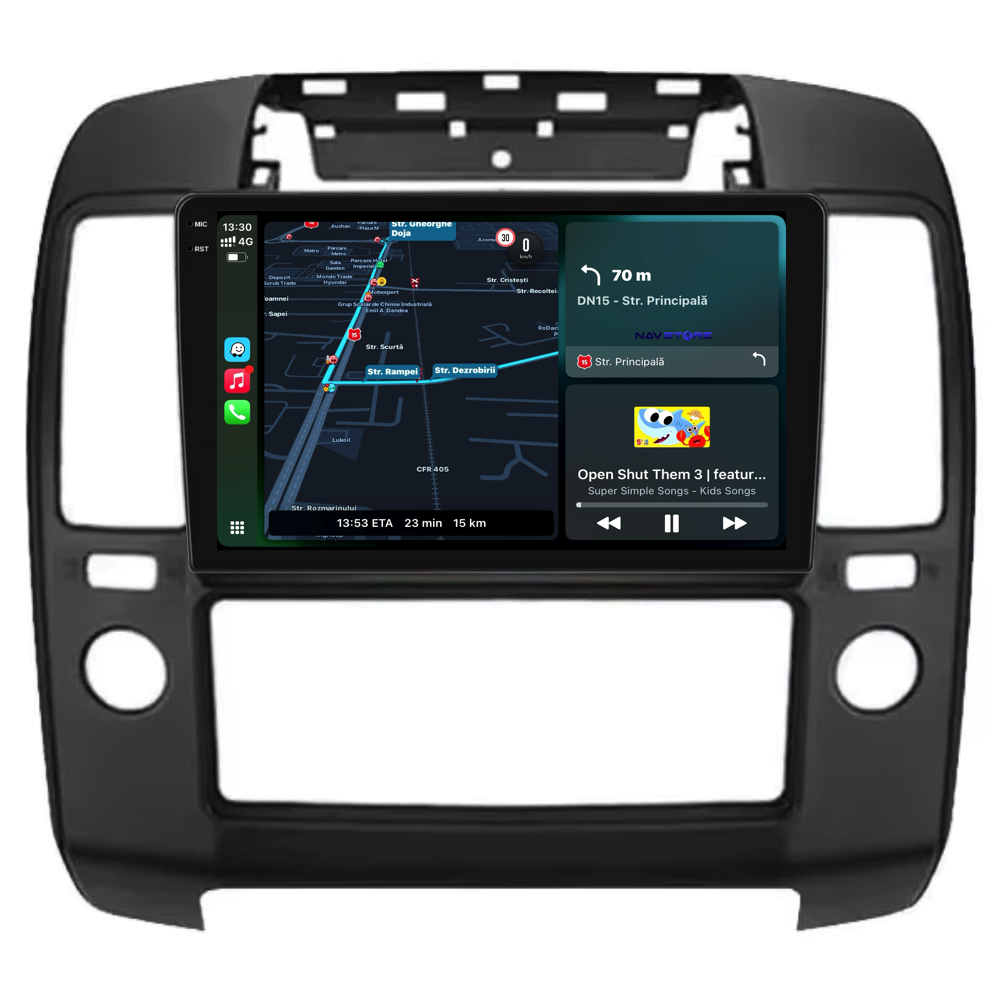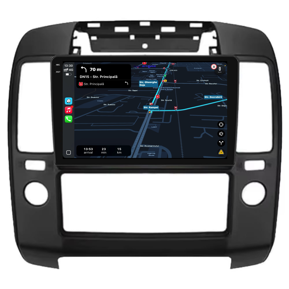 Sistem de operare: Android 13 Procesor: Octa-core Memorie RAM: 4GB Stocare interna (ROM): 64GB Dimensiune Display: 9 Inch Rezolutie ecran: 1360x800p Bluetooth: Bluetooth pentru apeluri, descarcare agenda telefonica si redare muzica WiFi: Da (Integrat) Slot Sim 4G: Da Conectivitate retea: 4G, Hotspot telefon, router extern, dongle 3G sau 4G, CarPlay Android Auto Microfon: Microfon integrat, cu posibilitate de conectare microfon extern Alimentare: 12V Putere audio: 4x45W Egalizator DSP: Procesor de sunet digital (DSP EQ) Compatibilitate USB SD: Compatibil cu USB de pana la 128GB, suport SD prin adaptor USB Compatibilitate aplicatii Android: Compatibil cu majoritatea aplicatiilor Android din Google Play Compatibilitate CarPlay si Android Auto: Da, compatibil cu iOS (CarPlay) si Android (Android Auto) Suport pentru limbi Romana, Engleza, Maghiara, Spaniola, Italiana, Germana, etc. Tip ecran: TouchScreen capacitiv, multi-touch, IPS Setari luminozitate: Da Radio RDS: Da Iesire subwoofer RCA: Da Iesire video RCA: Da, cu ajutorul unui adaptor USB Iesire audio RCA: Da GPS: Da, (Google Maps, Waze, HereWeGo) Senzori de parcare: Da (Preluare senzori de parcare cu afisaj unde este cazul) Control volan: Da (Preluare comenzi volan cu canbus sau analogic unde este cazul) Compatibilitate camera DVR: Da Compatibilitate camera marsarier: Da Manual de utilizare: Da Continut pachet: Navigatie Android Rama adaptoare Cablaj de alimentare Antena GPS Antena 4G Conectori RCA Cablaj pentru camera de marsarier, 2 cabluri USB Canbus (doar daca este cazul) Certificat de garantie Factura fiscala Navigatia este compatibila cu urmatoarele marci auto : Nissan: Navara (2004 – 2010)