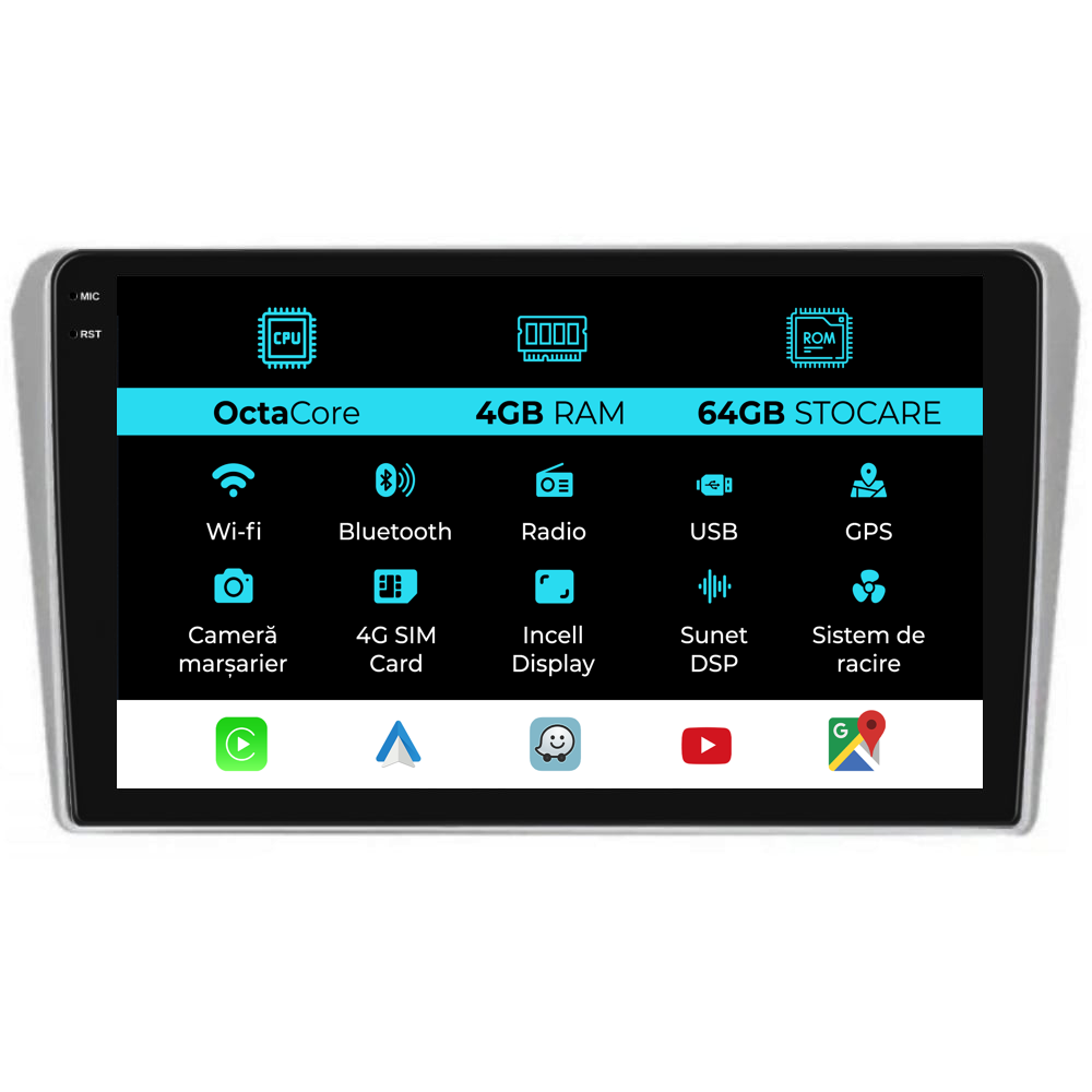 Sistem de operare: Android 13 Procesor: Octa-core Memorie RAM: 4GB Stocare interna (ROM): 64GB Dimensiune Display: 9 Inch Rezolutie ecran: 1360x800p Bluetooth: Bluetooth pentru apeluri, descarcare agenda telefonica si redare muzica WiFi: Da (Integrat) Slot Sim 4G: Da Conectivitate retea: 4G, Hotspot telefon, router extern, dongle 3G sau 4G, CarPlay Android Auto Microfon: Microfon integrat, cu posibilitate de conectare microfon extern Alimentare: 12V Putere audio: 4x45W Egalizator DSP: Procesor de sunet digital (DSP EQ) Compatibilitate USB SD: Compatibil cu USB de pana la 128GB, suport SD prin adaptor USB Compatibilitate aplicatii Android: Compatibil cu majoritatea aplicatiilor Android din Google Play Compatibilitate CarPlay si Android Auto: Da, compatibil cu iOS (CarPlay) si Android (Android Auto) Suport pentru limbi Romana, Engleza, Maghiara, Spaniola, Italiana, Germana, etc. Tip ecran: TouchScreen capacitiv, multi-touch, IPS Setari luminozitate: Da Radio RDS: Da Iesire subwoofer RCA: Da Iesire video RCA: Da, cu ajutorul unui adaptor USB Iesire audio RCA: Da GPS: Da, (Google Maps, Waze, HereWeGo) Senzori de parcare: Da (Preluare senzori de parcare cu afisaj unde este cazul) Control volan: Da (Preluare comenzi volan cu canbus sau analogic unde este cazul) Compatibilitate camera DVR: Da Compatibilitate camera marsarier: Da Manual de utilizare: Da Continut pachet: Navigatie Android Rama adaptoare Cablaj de alimentare Antena GPS Antena 4G Conectori RCA Cablaj pentru camera de marsarier, 2 cabluri USB Canbus (doar daca este cazul) Certificat de garantie Factura fiscala Navigatia este compatibila cu urmatoarele marci auto : Toyota : Avensis (2002-2008)